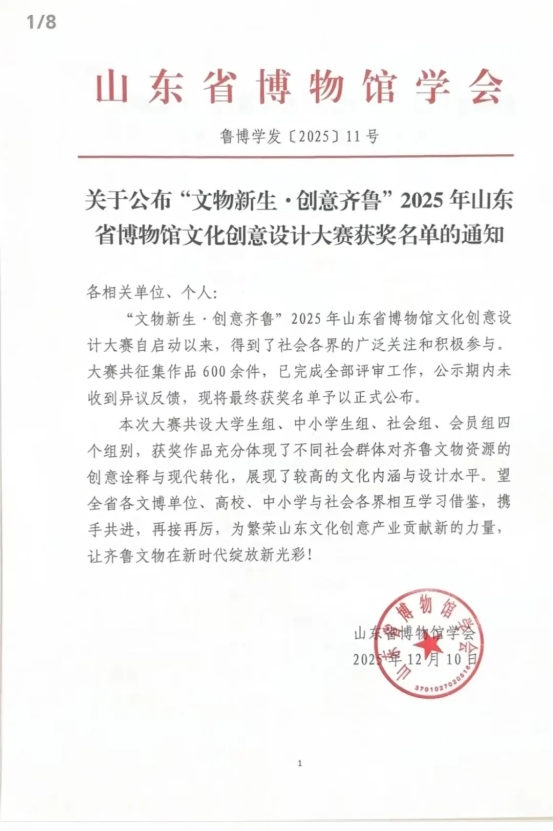近日,“文物新生·创意齐鲁”2025年山东省博物馆文化创意大赛圆满落幕,我馆在职工作人员李桂冉自主研发设计的文创作品凭借深厚的文化内涵与新颖的设计表达,从600多件参赛作品中脱颖而出,成功斩获铜奖,为我馆文创事业发展再添亮眼成果。