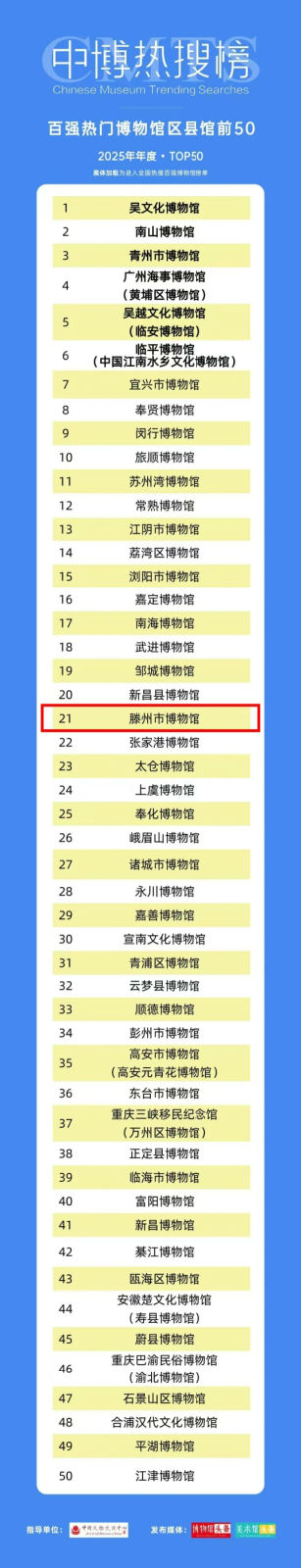 1月11日 由中国文物交流中心指导 博物馆头条统计发布 2025年全国热门博物馆纪念馆总榜 滕州市博物馆 荣登百强热门博物馆区县馆前50榜单